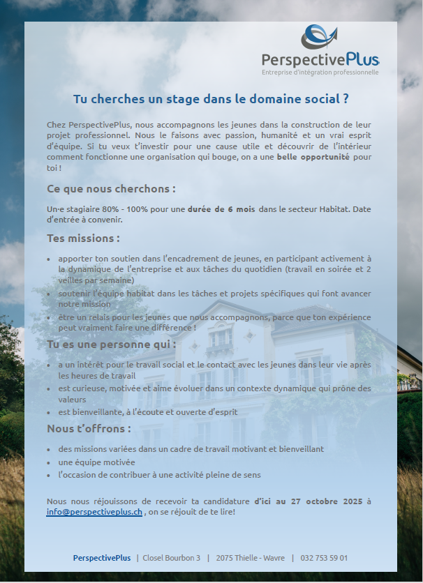 Nous nous réjouissons de recevoir votre dossier de candidature à l’adresse suivante : 📧 info@perspectiveplus.ch
